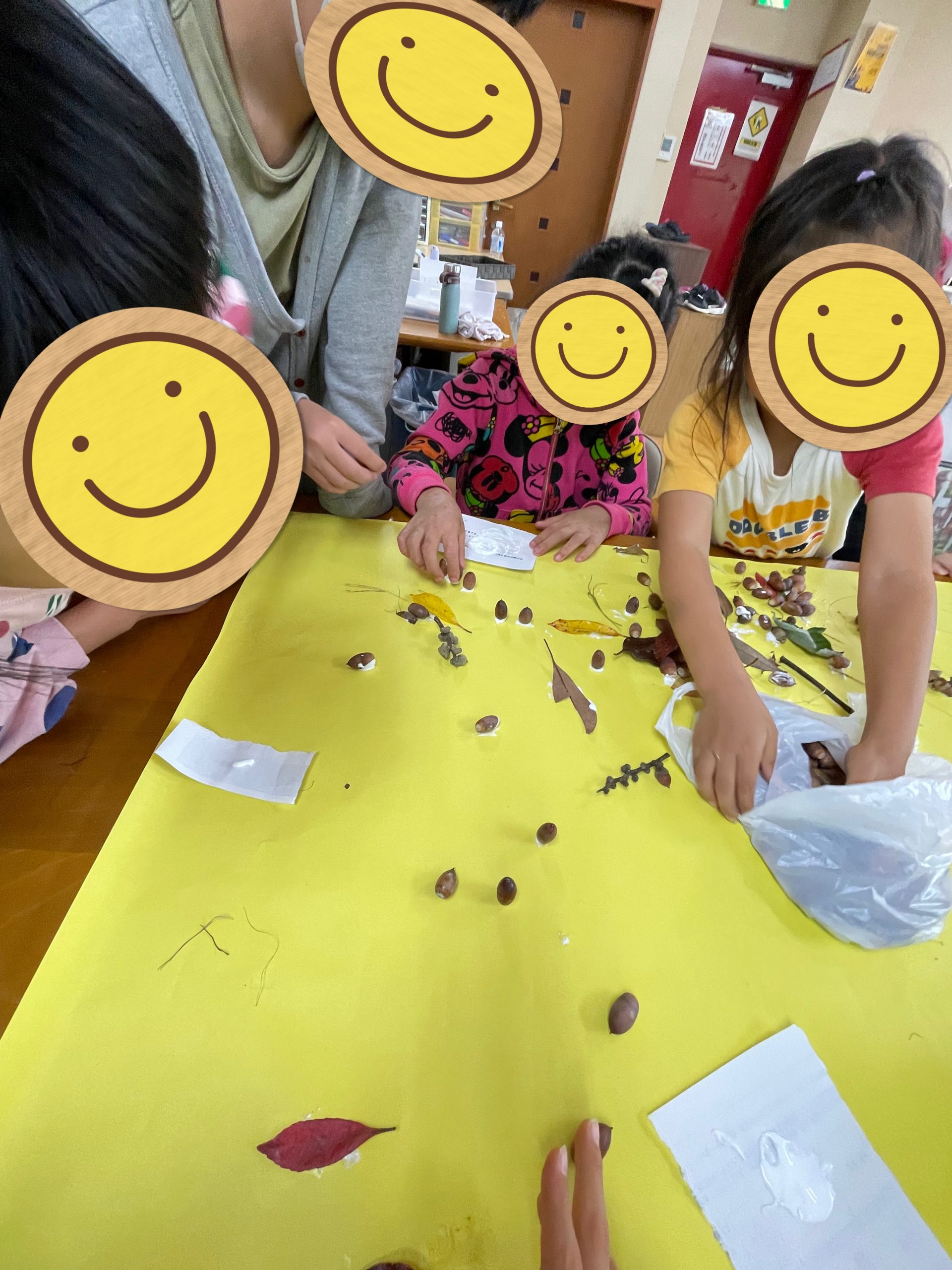 うらかみえきまえでは、お昼ご飯を食べてからみんなで拾ってきたどんぐりや落ち葉を色模造紙へ貼りました🍂✨️